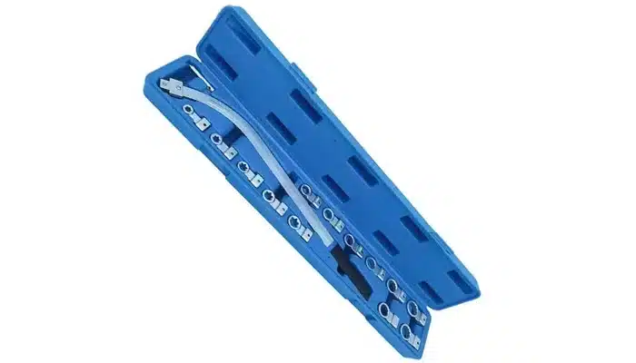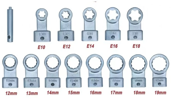 450mm varrella noleva hihnankiristin työkalu jossa mukana 12 kulmaiset avainkoot: 12, 13, 14, 15, 16, 17, 18 ja 19 mm sekä E-torxit: M10, E12, E14, E16 ja E18.