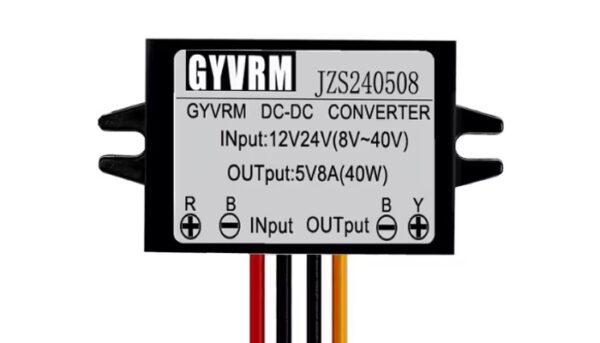 Jännitteenalennin DC 24/12 voltista, 5 volttiin / 8A, mitat 103x89x27mm.