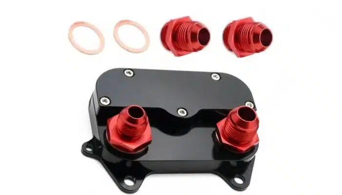 Öljynjäähdyttimen adapterilaippa VW Audi Skoda Seat 1.6/2.0TDi (OEM 03L 117 021 C), mukana AN8 ja AN10 nippavaihtoehdot.