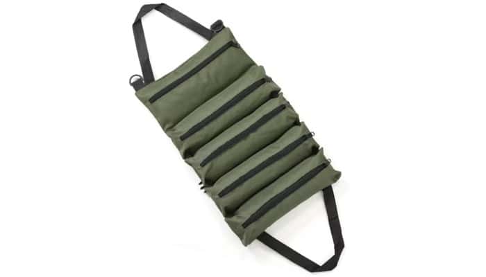 5kpl vetoketjullisia taskuja, johon mahtuu max 25cm pitkiä työkaluja, yhden taskun leveys 9cm.